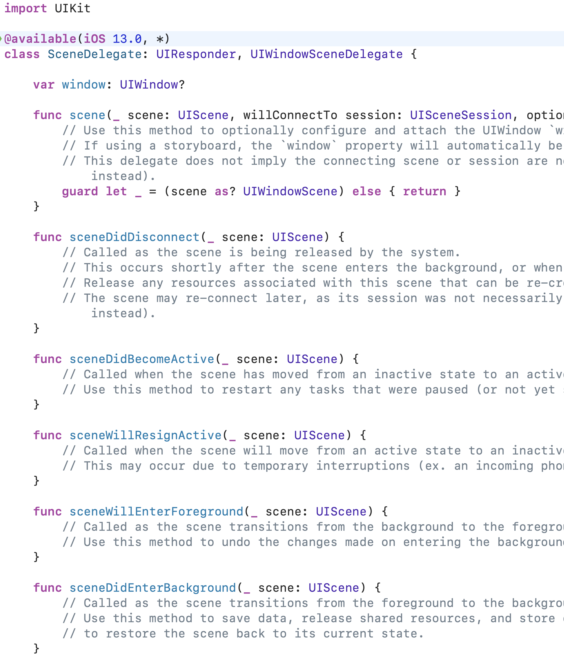 : iOS 13 버전이 되면서 AppDelegate의 UI 생명주기 역할을 SceneDelegate에서 할 수 있도록 따로 분리시켰다.