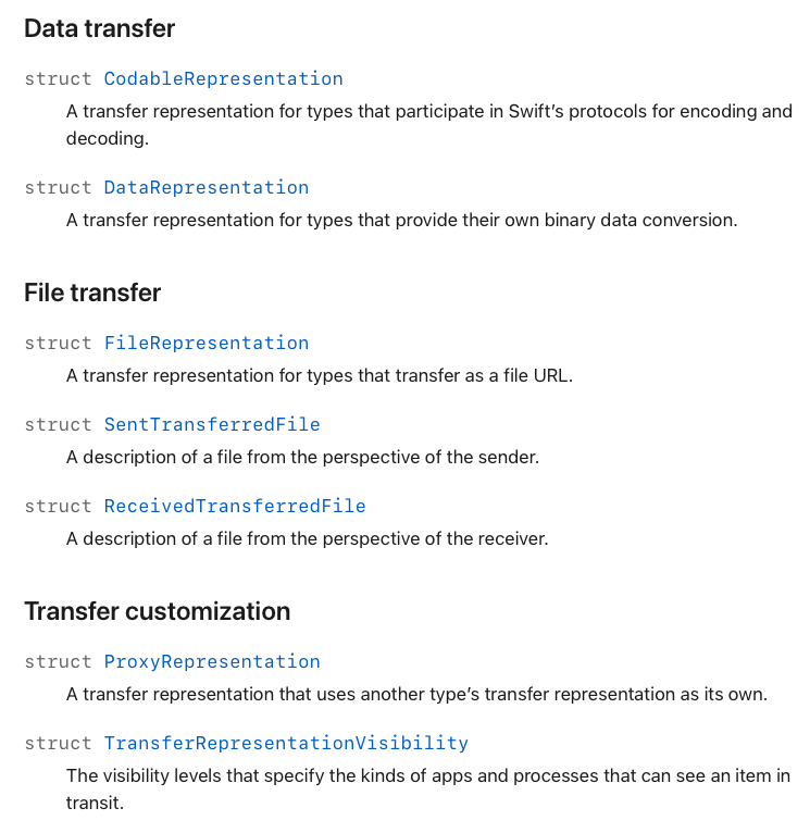 struct Movie: Transferable { let url: URL static var transferRepresentation: some TransferRepresentation { FileRepresentation(contentType: .mpeg4Movie) { movie in SentTransferredFile($0.url) } importing: { received in let copy: URL = URL(fileURLWithPath: "<#...#>") try FileManager.default.copyItem(at: received.file, to: copy) return Self.init(url: copy) } } }즉, 데이터를 파일로 전달하는것이 효율적일때 사용하죠.