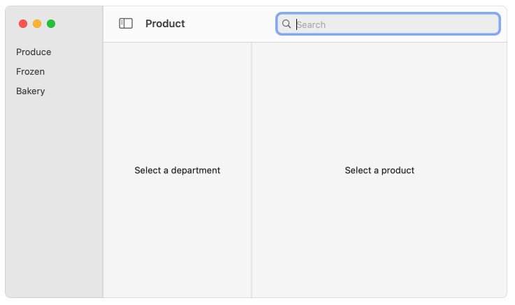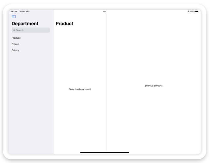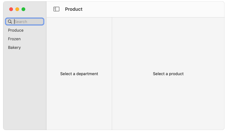 struct ContentView: View { @State private var departmentId: Department.ID? @State private var productId: Product.ID? @State private var searchText: String = "" var body: some View { NavigationSplitView { DepartmentList(departmentId: $departmentId) } content: { ProductList(departmentId: departmentId, productId: $productId) } detail: { ProductDetails(productId: productId) } .searchable(text: $searchText) // Adds a search field. } }우선 모델링 된 코드 부분을 제외한 공식문서의 코드입니다.