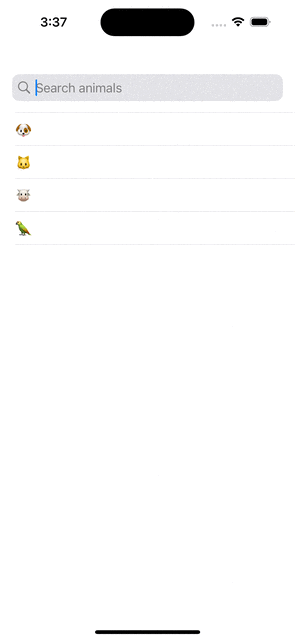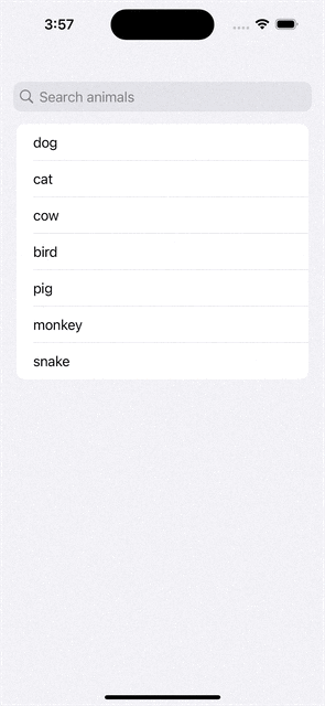 import SwiftUI // Model struct Animal: Identifiable { var id = UUID() var name: String } // View struct ContentView: View { let animals: [Animal] = [ .init(name: "dog"), .init(name: "cat"), .init(name: "cow"), .init(name: "bird"), .init(name: "pig"), .init(name: "monkey"), .init(name: "snake") ] @State private var searchText: String = "" var filteredAnimals: [Animal] { if searchText.isEmpty { return animals } else { return animals.filter { $0.name.contains(searchText.lowercased()) } } } var body: some View { NavigationStack { List(filteredAnimals) { animal in Text(animal.name) } } .searchable(text: $searchText, prompt: "Search animals") } }간단한 코드가 있습니다.
