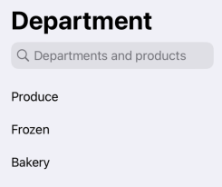 DepartmentList(departmentId: $departmentId) .searchable(text: $searchText, prompt: "Departments and products")prompt 파라미터를 사용합니다.
