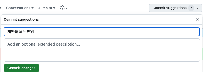그 후, 상단에서 Commit suggestions 버튼을 눌러 하나의 커밋으로 적용할 수 있어요.