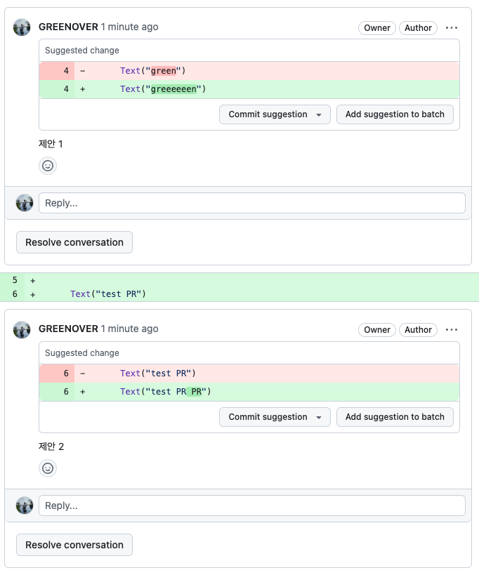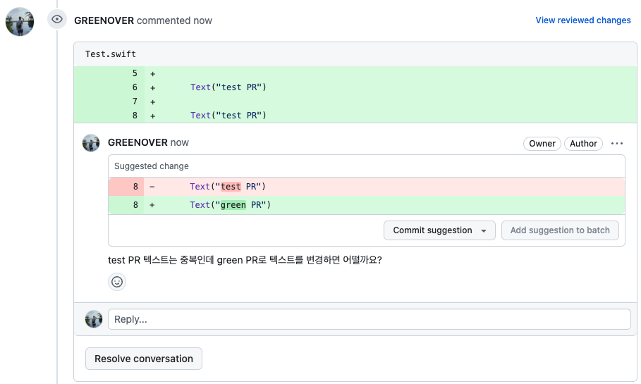 그럼 이제 제안할 수정된 코드를 리뷰어가 작성합니다.