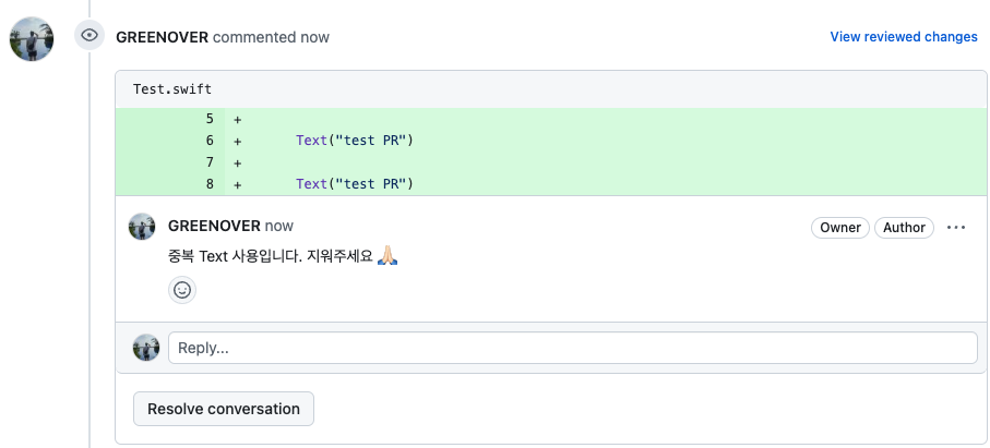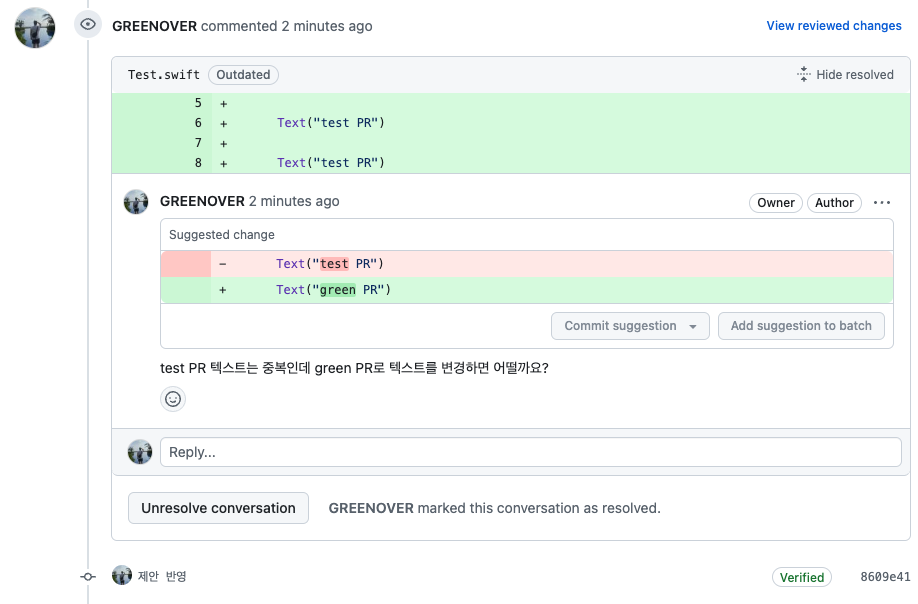 그러고 이제 Review Changes로 팬딩된 제안 및 리뷰 코멘트들을 반영하면 아래와 같이 PR 페이지에 나타납니다.