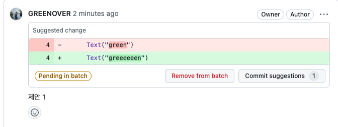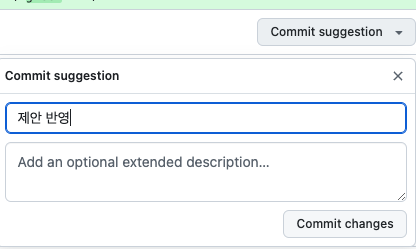 그럼 기본적으로 저 Commit suggestion 버튼을 눌러 반영할 수 있어요.