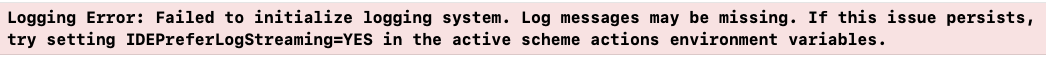 해당 에러 메시지는 로깅 시스템을 초기화하지 못했기에 로그 메시지가 누락될 수 있음을 경고합니다. 해결하려면 IDEPreferLogStreaming를 YES로 활성화 하라는 경고 문구를 나타내고 있습니다.