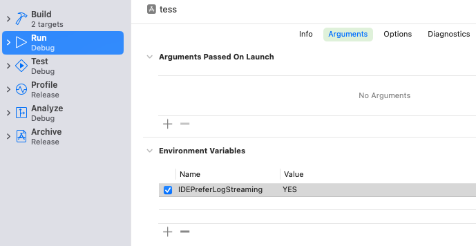 그 후, Run Action에서 Environment Variables에 해당 IDEPreferLogStreaming를 YES로 넣어주며 설정해줍니다.
