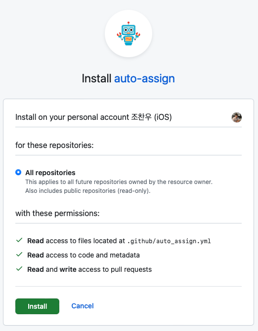 이러면 이제 해당 본인의 레포에서는 auto_assign.yml 파일로 설정만 해놓는다면 해당 앱이 동작하여 정상적으로 오토 어싸인이 됩니다!