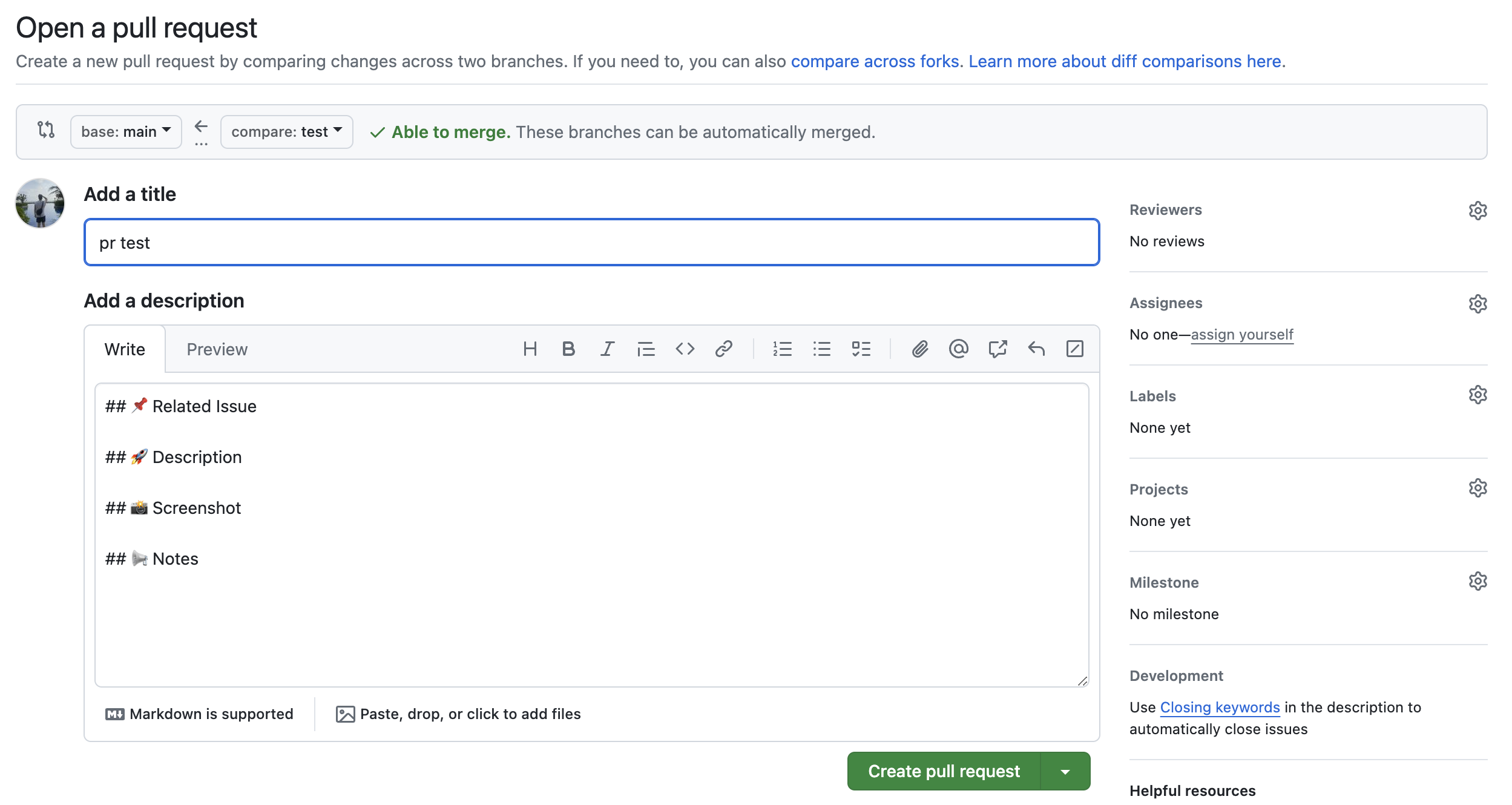 그럼 한번 PR 템플릿이 정상으로 설정 되어 있는지 확인해볼까요?
