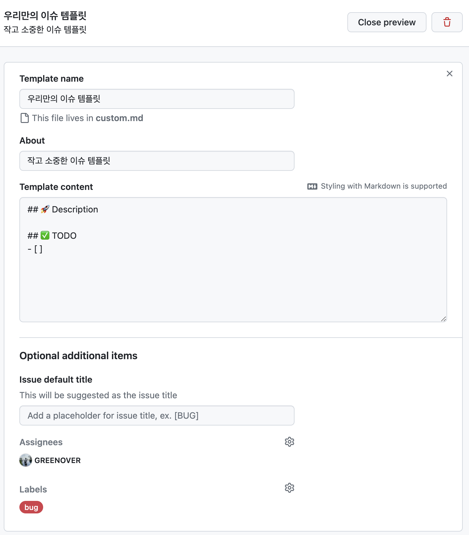 템플릿 이름부터 설명, 그리고 이슈 본문에 들어갈 형식, 어싸인, 레이블까지 모두 설정해볼 수 있죠!