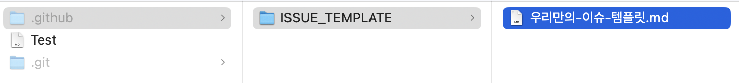 아래와 같이 로컬에서 직접 해당 .github 폴더를 생성해 하위에 ISSUE_TEMPLATE 폴더를 만들고 그 하위에 우리 이슈 템플릿 파일을 만들어줍니다.