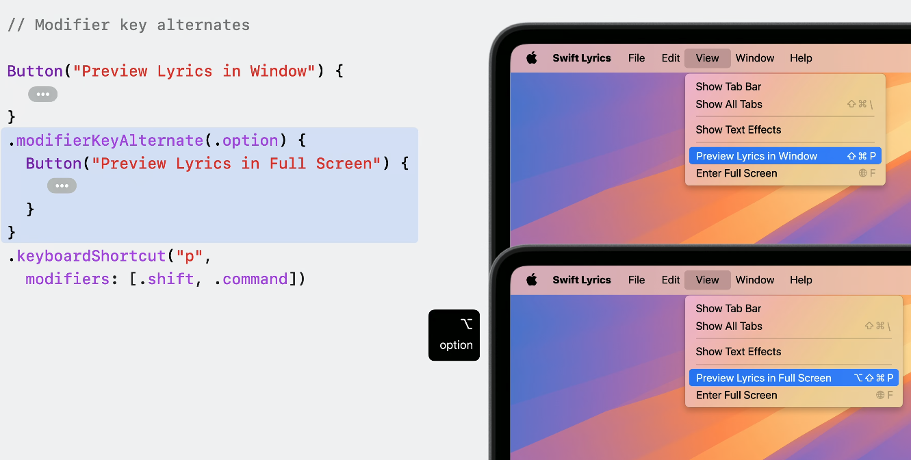modifierKeyAlternate 메서드를 이용해 option키를 지정하고 해당 커맨드를 눌러 동작을 시키도록 구성할 수 있죠.