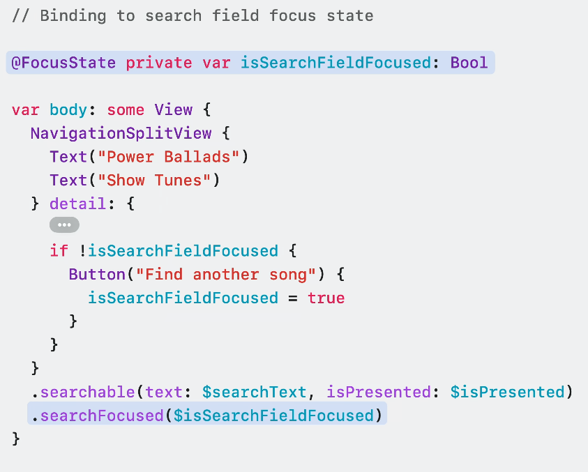 searchFocused를 이용해 프로그래밍 방식으로 검색 필드의 포커싱을 제어할 수 있습니다.