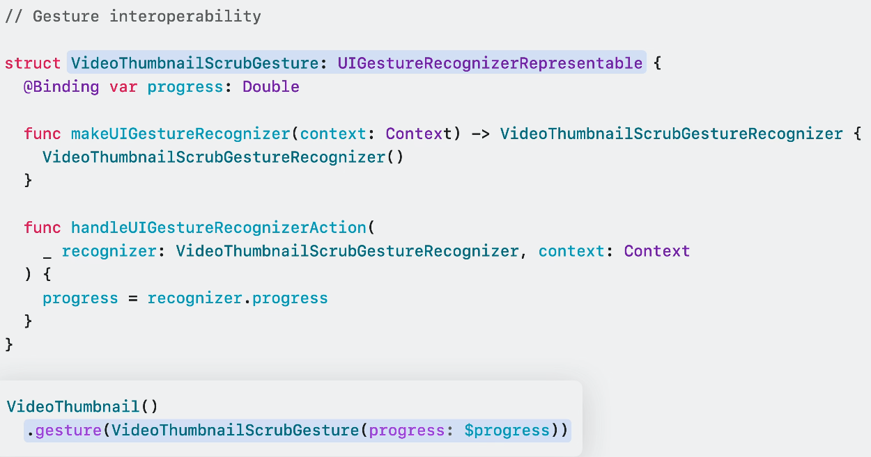 제스쳐를 보면 이제는 이렇게 UIGestureRecognizerRepresentable을 채택해 SwiftUI 뷰에 적용할 수 있습니다!