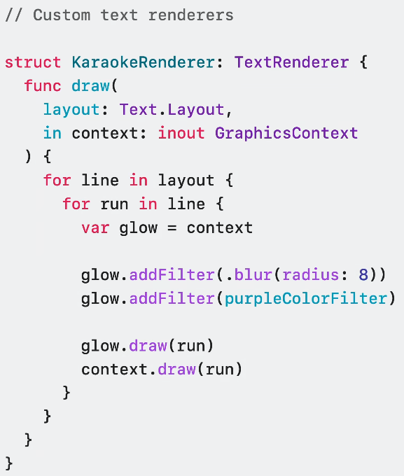 KaraokeRenderer가 원본 뷰 뒤에 텍스트의 사본을 만들면 텍스트가 흐릿해지고 텍스트에 퍼플 색상이 적용되며 빛날 수 있죠.