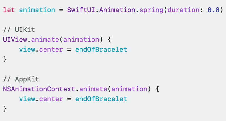 SwiftUI와 UIKit이 NSAnimationContext에 대한 새로운 애니메이션 메서드를 정의함으로 SwiftUI 애니메이션을 사용해 UIKit이나 AppKit에서도 십분 활용할 수 있습니다.