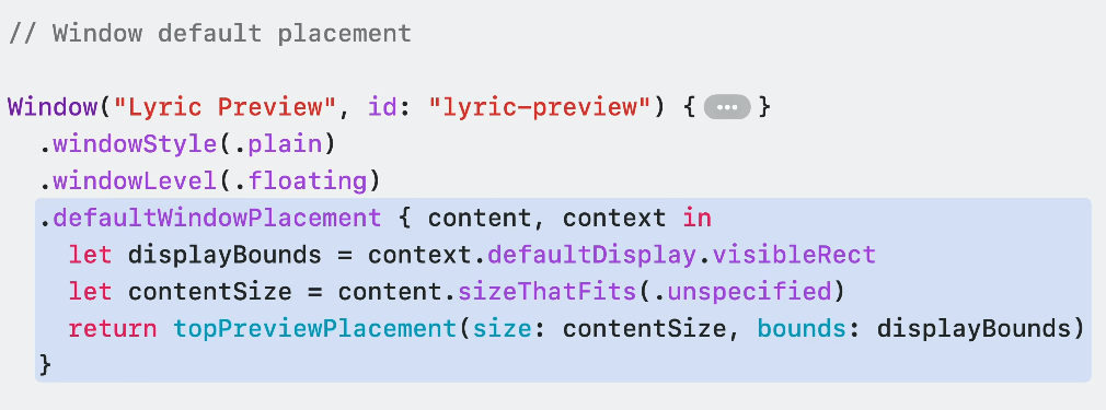 이렇게 윈도우 스타일부터 윈도우 레벨까지 설정하고, 화면 상단에 윈도우를 배치해서 가사의 나머지 부분이 가려지지 않도록하고 디스플레이와 컨텐츠 크기를 고려해 가운데 배치할 수 있죠.