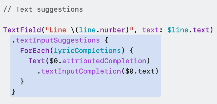 이제 어떤 텍스트필드던지 textInpuSuggestions을 이용해 텍스트 제안을 추가할 수 있습니다.