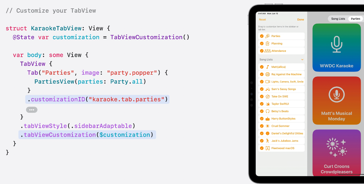 TabViewCustomization을 이용하면 탭을 재배치하거나 제거하는 등 동작을 사용자에 맞춰 커스텀하게 해둘 수도 있습니다.