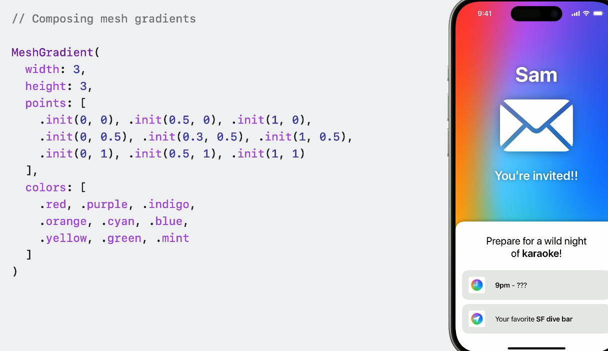 이제 SwiftUI를 통해 새로운 탭 뷰 그리고 메시 그라이언트 등 다양한 컨트롤러를 사용할 수 있습니다.