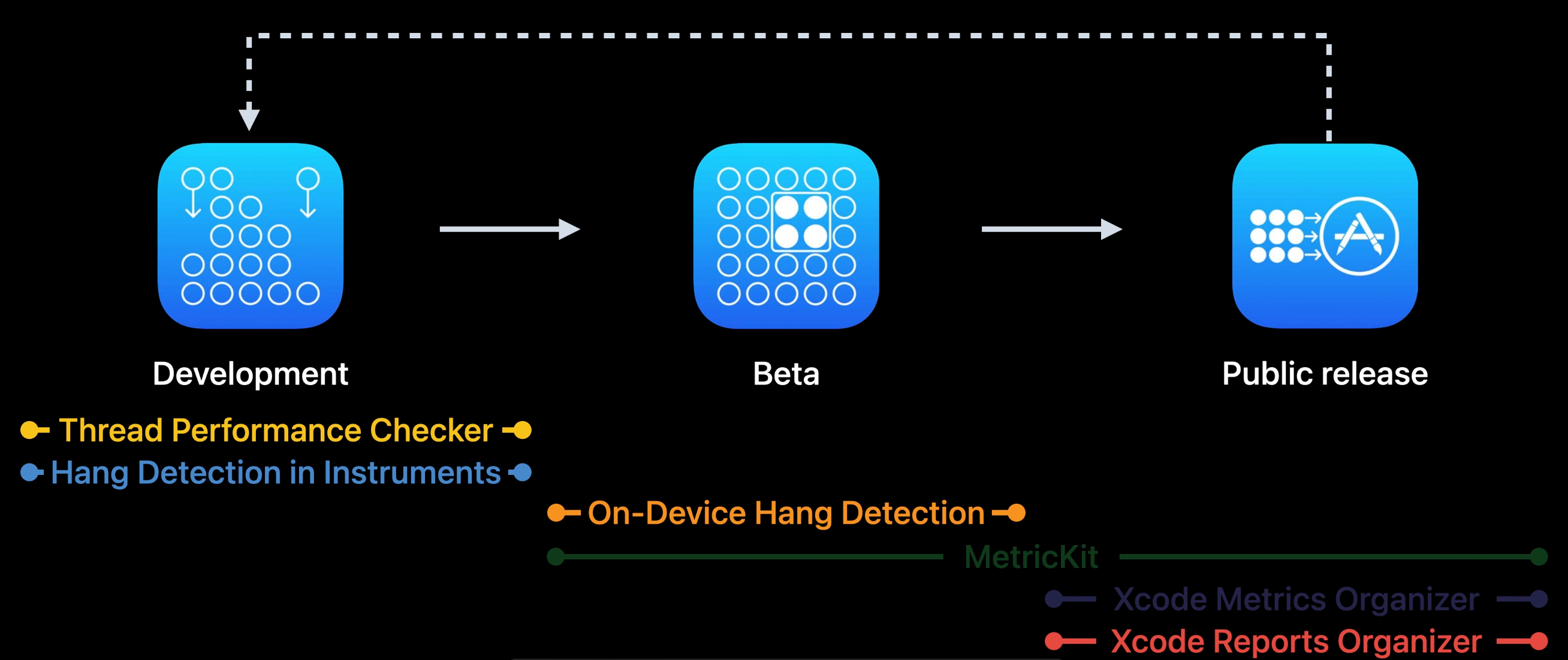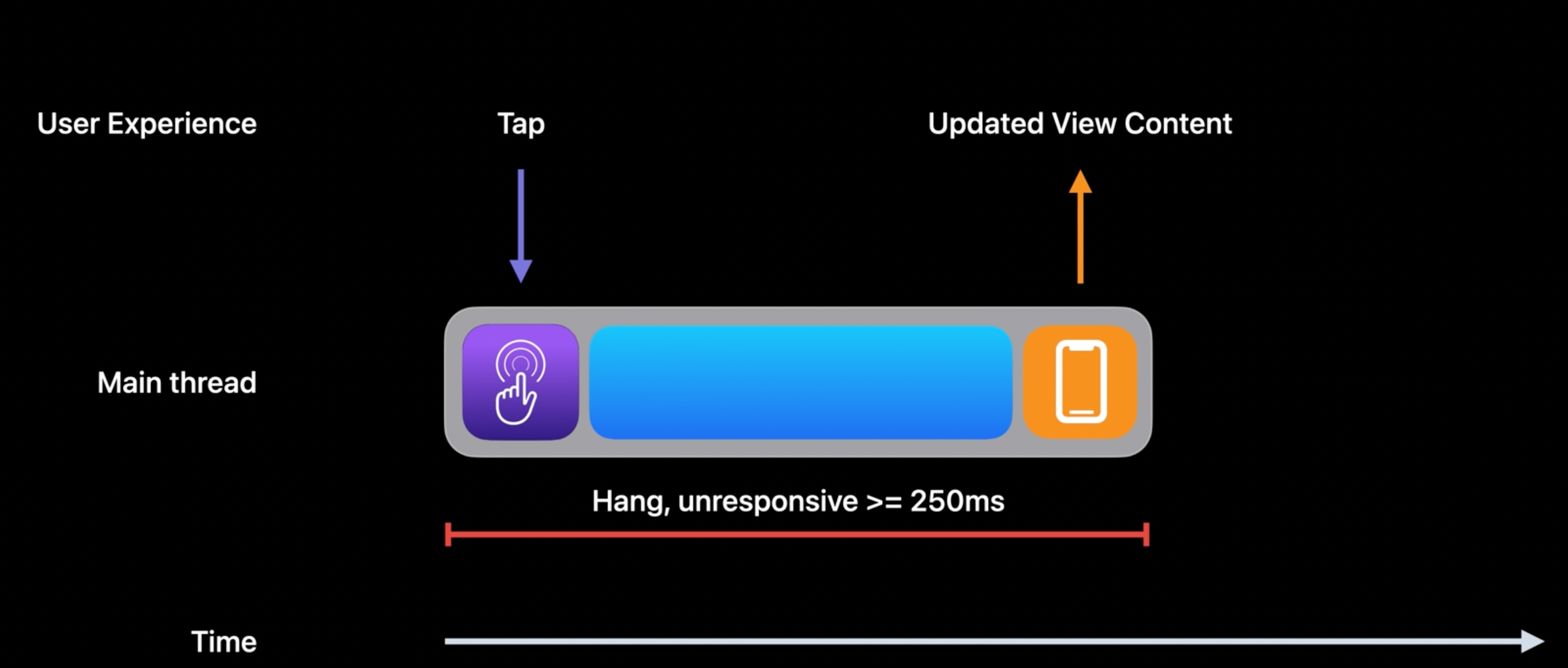 WWDC 2022의 Track down hangs with Xcode and on-device detection 섹션에서 Xcode와 디바이스를 통해 이 행을 추적하는 방법에 대해 자세히 설명해주고 있습니다.