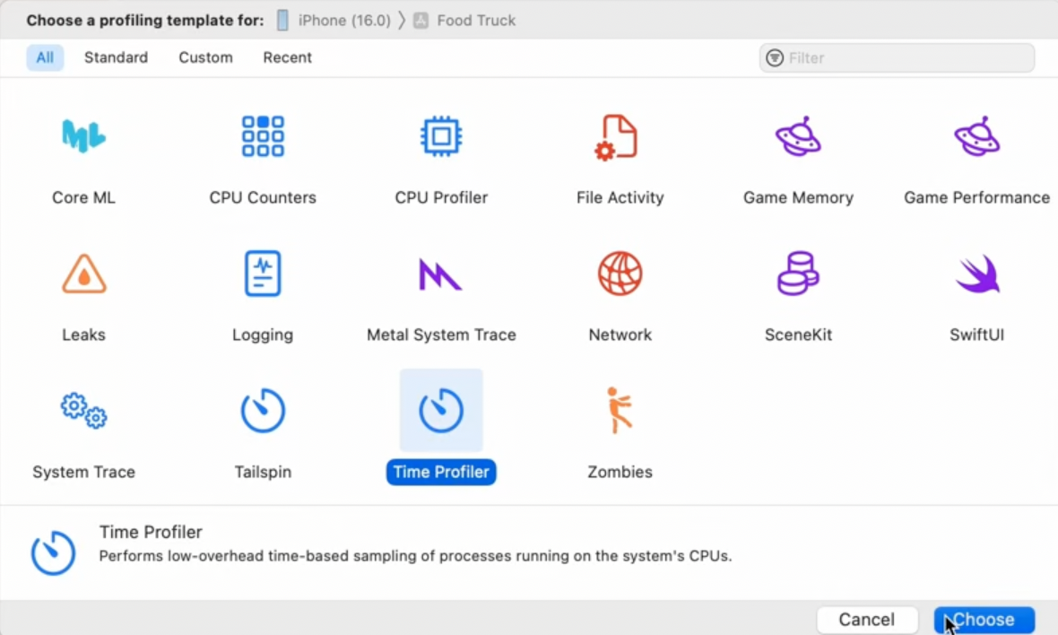 Profile로 앱 실행 후 Time Profiler를 선택해줍니다.