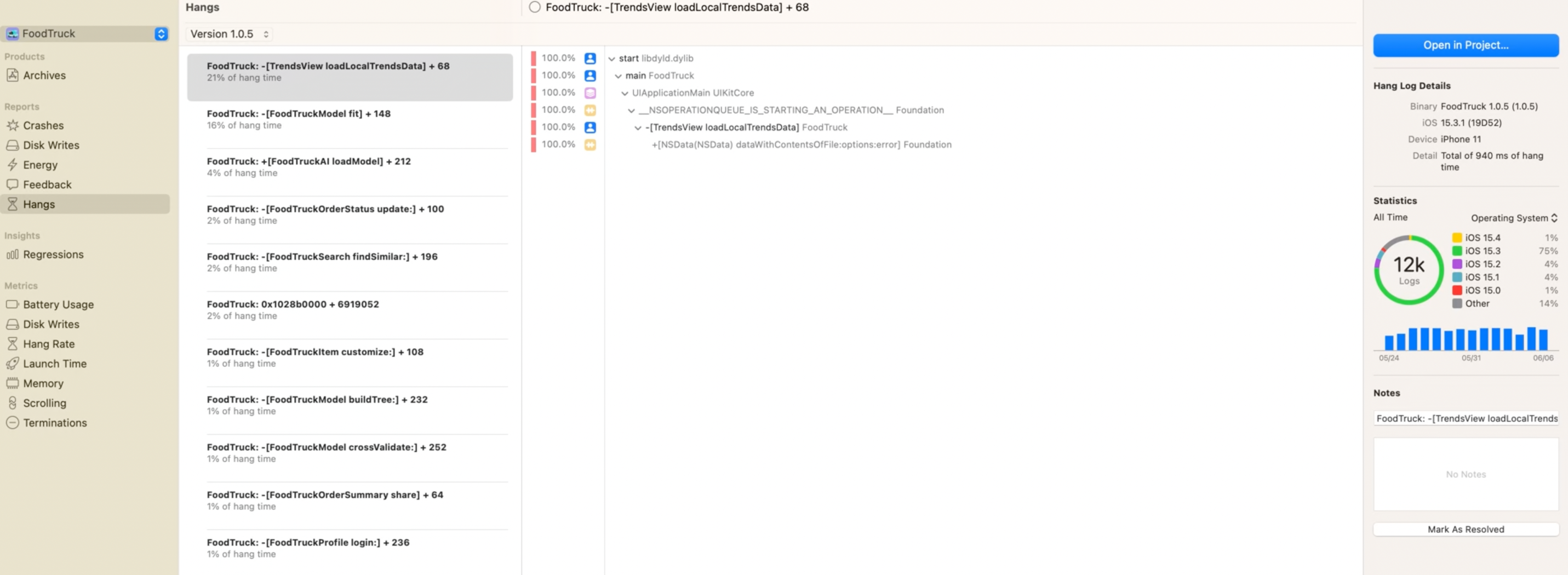 Xcode 14부터는 Xcode Organizer에서 Hang reports를 지원해 사용자들의 기기로부터 비정상 행 진단을 집계해 전달받을 수 있습니다 😄