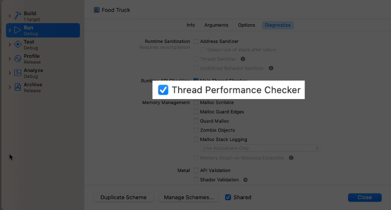 Development 단계에선 스레드 성능 검사를 통해 앱을 디버깅하는 동안 능동적으로 추적하지 않고도 행을 일으키는 스레드 문제를 알려줍니다.