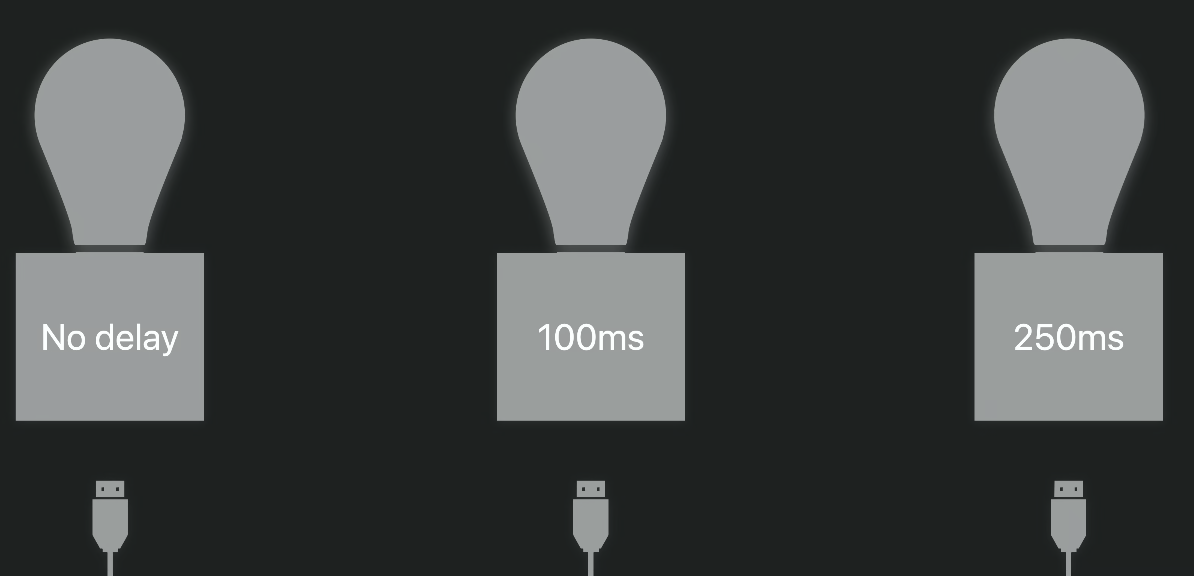이렇게 전구에 딜레이가 걸릴때 100ms가 임계값으로 대략 100ms 이하로 딜레이가 걸리면 실제 딜레이라고 인식할 수 없습니다.