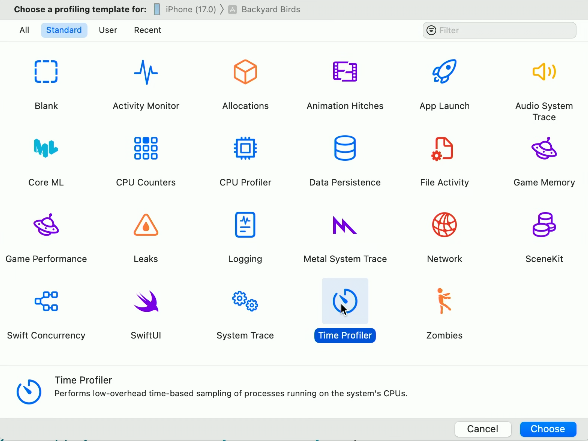 여기서 우리는 Time Profiler를 선택해 진행합니다.