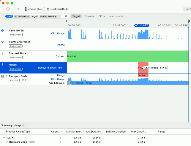 이번에는 거기서 한번 더 나아가 WWDC23에서 소개된 Analyze hangs with Instruements 세션을 보면서 이제는 행을 어떻게 분석하는지를 좀 더 자세히 보겠습니다!