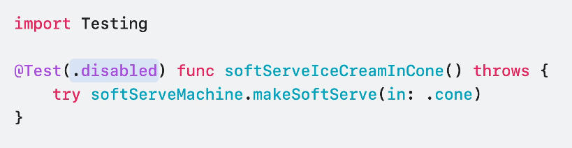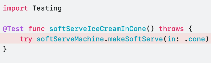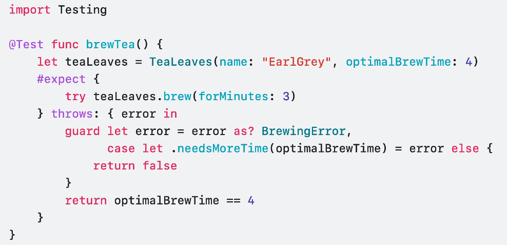 import Testing @Test func brewTeaError() throws() { let teaLeaves = TeaLeaves(name: "EarlGrey", optimalBrewTime: 4) #expect(throws: (any Error).self) { try teaLeaves.brew(forMinutes: 200) } }물론, do catch 구문을 통해 오류 체크를 할 수도 있지만 장황하게 그렇게 쓸 필요가 전혀 없는것이죠.
