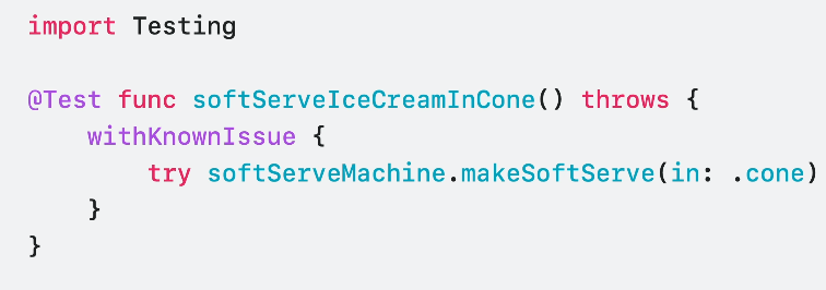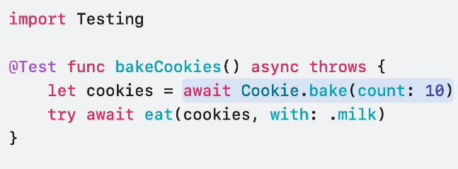 import Testing @Test func brewTeaSuccessfully() throws { let teaLeaves = TeaLeaves(name: "EarlGrey", optimalBrewTime: 4) let cupOfTea = try teaLeaves.brew(forMinutes: 3) #expect(cupOfTea.quality == .perfect) }이렇게 thorws를 통해 에러 테스트도 충분히 테스트가 가능합니다.