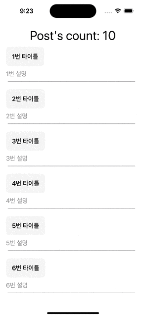 // MARK: - 뷰 struct ContentView: View { @StateObject var viewModel: ContentViewModel = .init() var body: some View { VStack(spacing: 10) { Text("Post's count: \(viewModel.postsCount)") .font(.largeTitle) ScrollView { LazyVStack(spacing: 20) { ForEach(0..<(viewModel.posts.count), id: \.self) { index in HStack(spacing: 0) { VStack(alignment: .leading, spacing: 10) { Text(viewModel.posts[index].title) .font(.headline) .foregroundColor(.primary) .padding() .background(Color.gray.opacity(0.1)) .cornerRadius(10) Text(viewModel.posts[index].description) .font(.body) .foregroundColor(.secondary) Rectangle() .fill(.gray) .frame(height: 1) .padding(.horizontal, 5) } Spacer() } .onAppear { guard index == viewModel.posts.count - 1 else { return } Task { await viewModel.getPosts() } } } } } } .padding() .onAppear { Task { await viewModel.getPosts() } } } }뷰는 크게 설명할건 없이 간단해요!