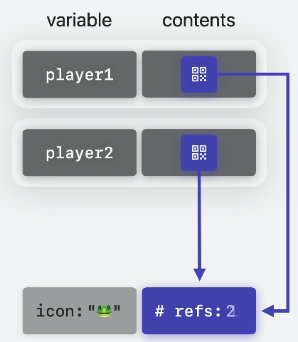 그러고 player2를 동일하게 할당했을때 player1과 동일하기에 참조가 복사됩니다.