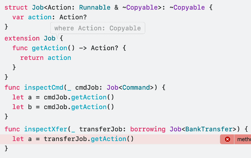 또한 이렇게 타입에 제네릭을 사용한다해도 해당 타입은 여전히 Copyable하기에 이렇게 데이터 사용을 위해 ~Copyable을 적용해줘야 복사할 수 없도록 만들어집니다.