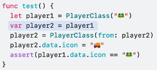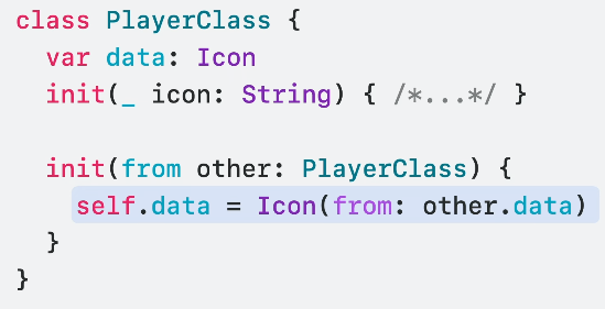 그런데, player2를 보면 자체적으로 이니셜라이저를 호출해 전체 복사본을 만들고 있습니다.