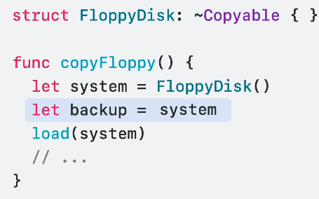 즉, ~Copyable을 채택하는 타입은 복사할 수 없는 타입이 됩니다.