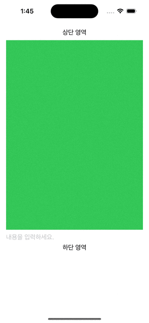 import SwiftUI struct ContentView: View { @State var text: String = "" var body: some View { ScrollView { VStack { Text("상단 영역") Rectangle() .fill(.green) .frame(height: 500) TextField( "내용을 입력하세요.", text: $text ) Text("하단 영역") } } .padding() } }이런 코드를 실제 돌려보면요.