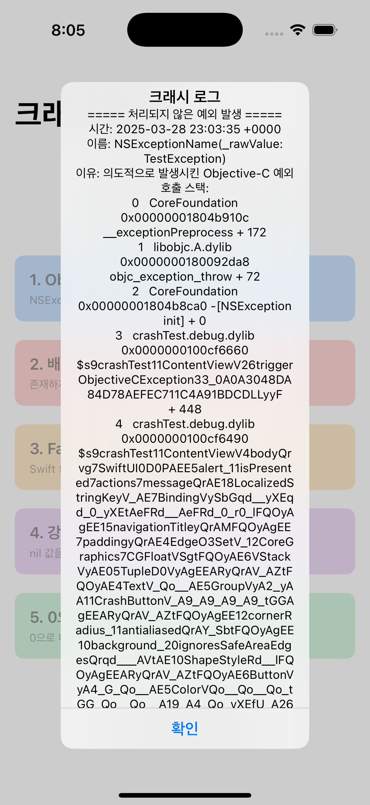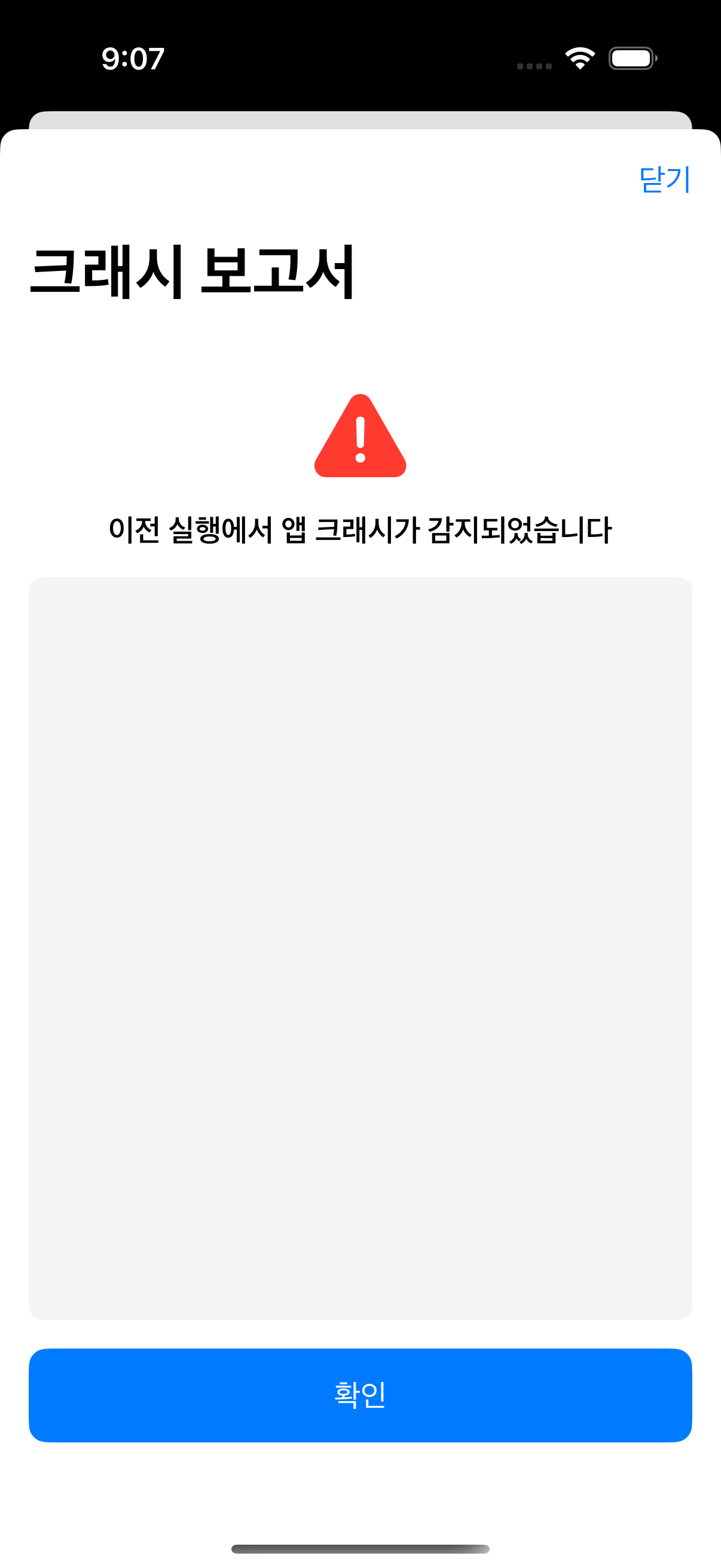 import SwiftUI @main struct crashTestApp: App { @State private var showingCrashReport = false @State private var lastCrashLog = "" init() { // 예외 핸들러 설정 CrashHandler.shared.setup() // 이전 크래시 확인 if let crashLog = CrashHandler.shared.checkForPreviousCrash() { lastCrashLog = crashLog showingCrashReport = true } } var body: some Scene { WindowGroup { ContentView() .sheet(isPresented: $showingCrashReport) { CrashReportView(crashLog: lastCrashLog, showingCrashReport: $showingCrashReport) } } } }앱 실행 시 CrashHandler를 설정하고 이전 크래시를 확인하죠.