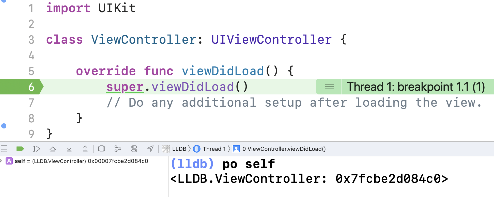 - Xcode에서 breakpoint를 설정하거나 일시정지 시키면 LLDB 콘솔이 우측하단 디버그 콘솔에 나타남