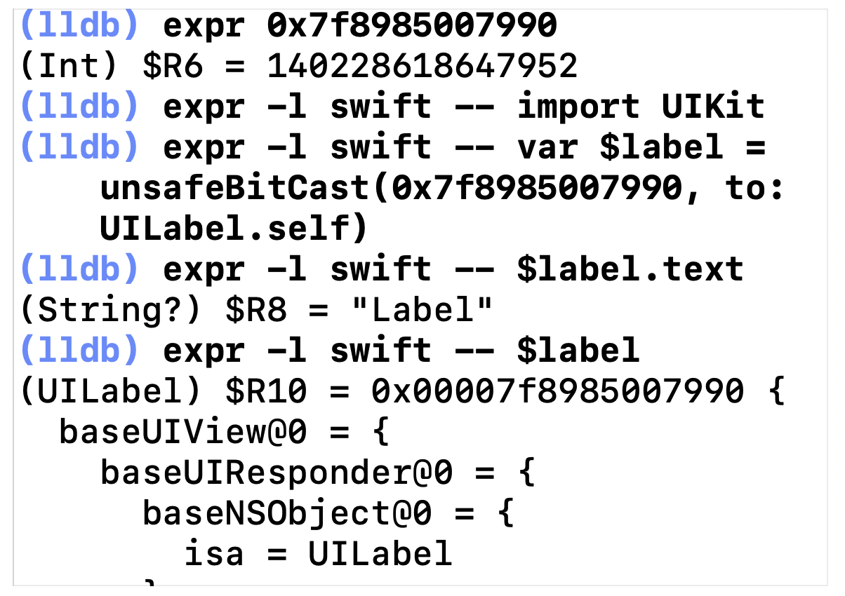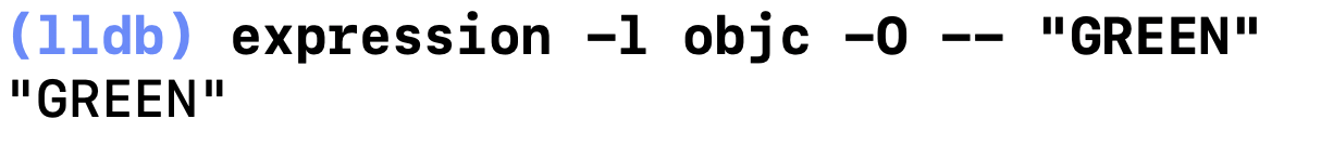 - iOS에서는 Swift와 Object-C의 두 프로그래밍 언어로 표현된것이 존재하는데 LLDB에서 만약 Object-C 코드에서 멈춘 후 po 테스트를 Swift로 하게되면 에러가 나며 반대의 경우도 에러를 내뱉는다. 그래서 해당 언어 코드로 변환하여 실행을 위해 강제로 -l (language) 옵션을 사용할 수 있다. (lldb) expression -l objc/swift -O -- "표현"