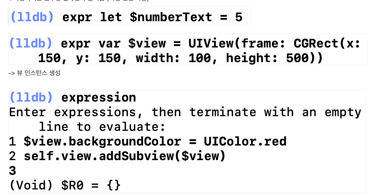 LLDB를 이제 조금 활용할 수 있을것 같은? 느낌이 들었다. 그전에는 해당 기초 설정에 불과했다면 이제부터 학습한 명령어를 통해 디버깅중에 새로 변수나 함수를 만들어 뷰에 그려볼 수도 있고 여러 변수와 객체의 정보를 얻어 값을 변경해가며 테스트를 해볼 수 있게 되었다.