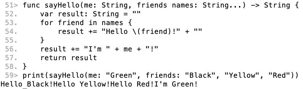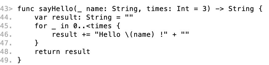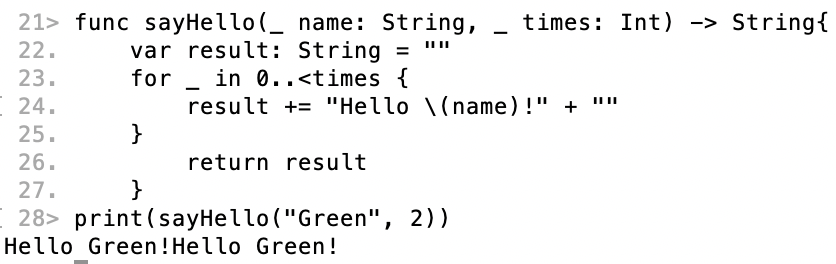say(name: String, times: Int) -> String ---> say(name:times:)