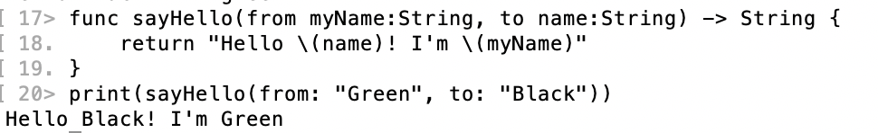 전달인자 레이블 사용 방법 위와 같이 매개변수 이름 앞 from / to라는 전달인자 레이블을 통해 함수를 생성한 뒤 함수 호출 시 전달인자 레이블을 통해 호출합니다.